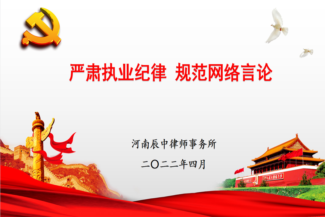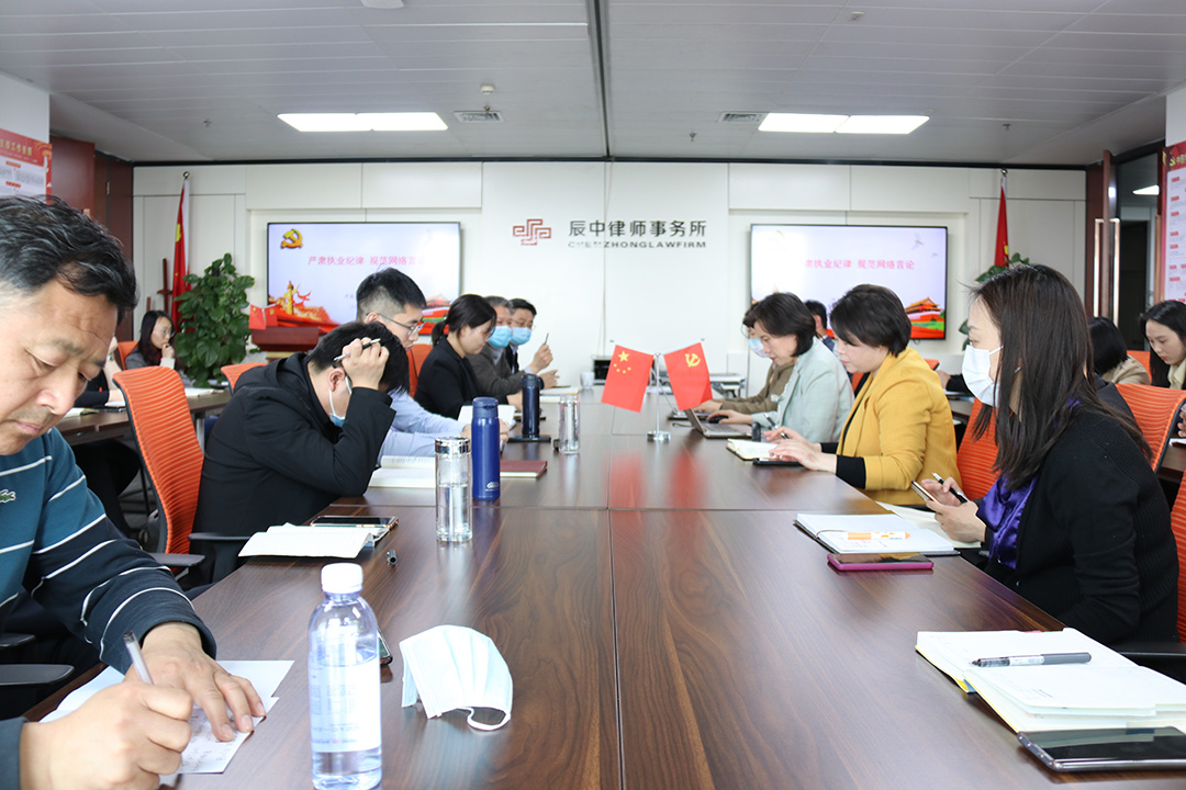 2022年3月31日,郑州市律师协会、河南省律师协会直属分会根据《中华人民共和国律师法》、《律师和律师事务所违法行为处罚办法》、《律师协会会员违规行为处分规则(试行)》、《中华全国律师协会关于禁止违规炒作案件的规则(试行)》等相关法律法规、行业规范和国务院关于开展“清朗”系列专项行动有关要求,联合下发《关于严肃执业纪律 规范律师网络言论行为的通知》;当日,辰中所将该通知推送至律所微信群,要求全体律师及行政人员认真学习、深刻领会、抓好落实。4月2日下午,辰中所组织全体律师再次对本通知内容及相关法律法规规则进行集中学习、讨论,因在外办案未能参会的律师通过网络参加本次学习活动。活动由辰中所党支部书记王宇主持。