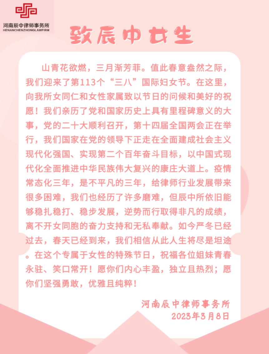 逐梦新征程,巾帼绽芳华。我们国家在党的领导下正走在全面建成社会主义现代化强国、实现第二个百年奋斗目标,以中国式现代化全面推进中华民族伟大复兴的康庄大道上。这些都离不开妇女同胞的无私奉献和奋力支持。辰中女律师一定能与亿万妇女同胞一同在实现“中国梦”的奋斗征程中绽放美丽芳华!