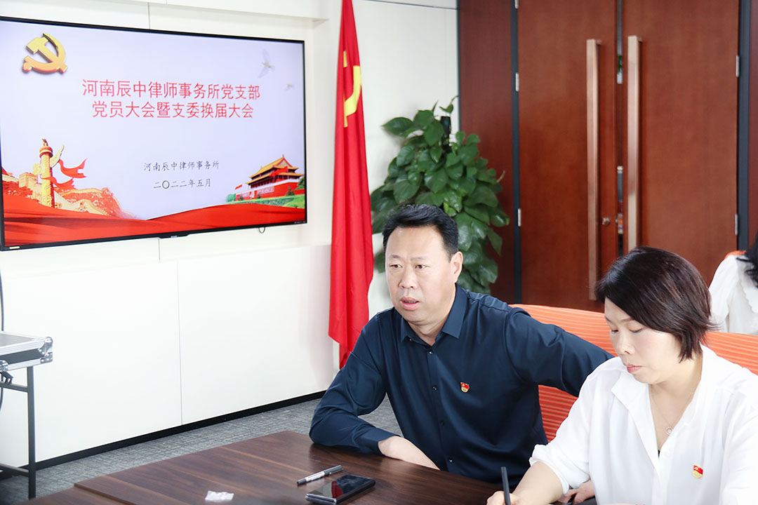 党支部书记王宇代表上一届支部委员会从党建运行机制、开展党员活动、媒介与载体宣传、党员律师培养、公益法律服务、党建交流促进等方面对上一届支部委员会的各项工作情况作了全面的报告和回顾,并感谢各级行业党委对辰中党支部的关心与厚爱,倡议全体党员积极配合支持下一届支部委员会的工作。