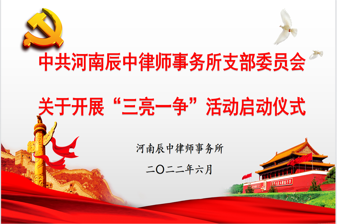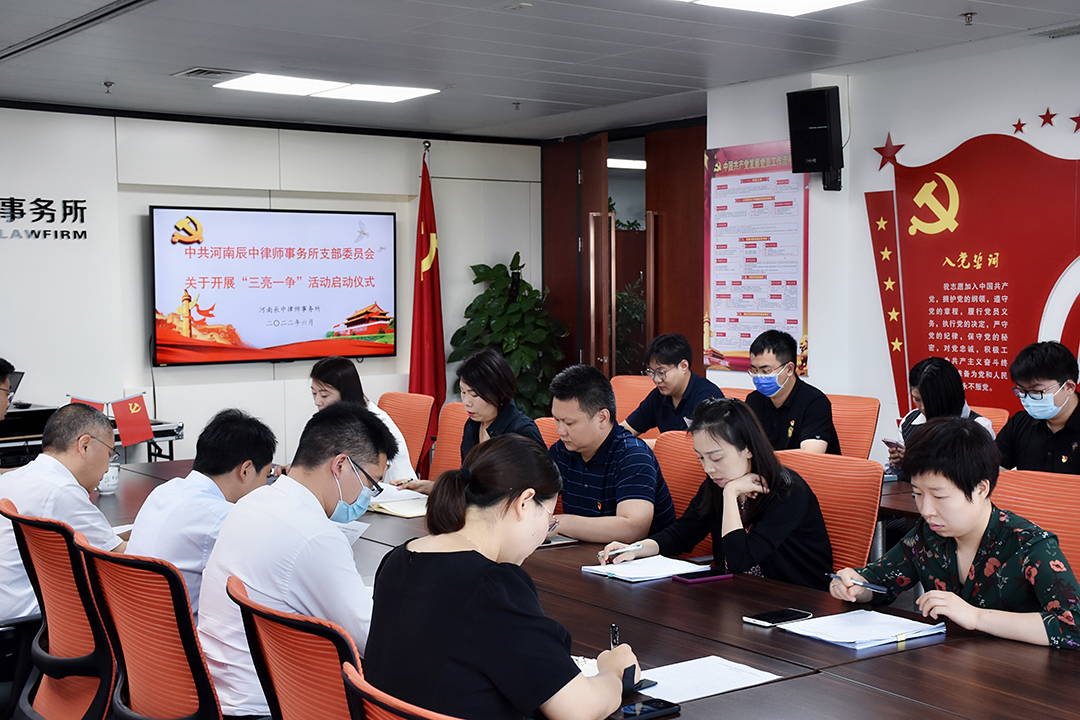 为认真贯彻落实郑州市第十二次党代会部署安排,大力推动辰中所党支部党建工作提质量、见成效、创品牌,进一步引导激励广大党员律师守初心、担使命,切实发挥党员在各项工作中的先锋模范作用, 根据《中共郑州市律师行业委员会关于转发中共郑州市司法局委员会〈关于在基层党组织和广大党员中开展三亮一争活动的通知〉的通知》精神,6月13日上午,辰中所党支部开展“三亮一争”促提升、党建引领聚合力主题党日活动暨“三亮一争”活动启动仪式。