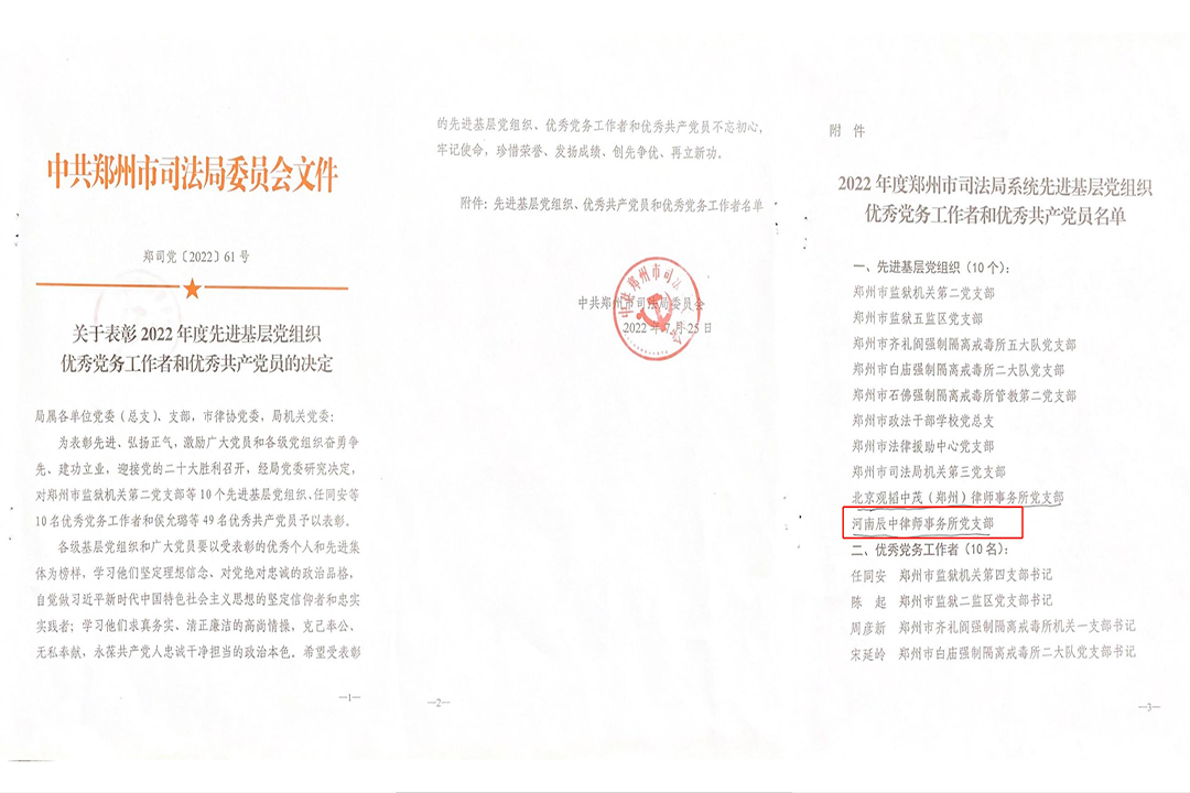 为表彰先进,弘扬正气,激励广大党员和多级党组织奋勇争先、建功立业,迎接党的二十大胜利召开,日前,郑州市司法局党委对2022年度先进基层党组织,优秀党务工作者和优秀共产党员进行了表彰,辰中党支部被授予“2022年度郑州市司法局系统先进基层党组织”。辰中党支部宣传委员马德方传达了《中共郑州市司法局委员会关于表彰2022年度先进基层党组织优秀党务工作者和优秀共产党员的决定》,并希望大家要不忘初心、牢记使命,珍惜荣誉、发扬成绩、创先争优、再立新功。