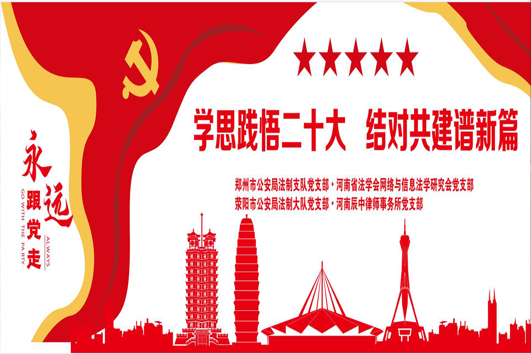 为热烈庆祝中国共产党成立102周年,深入学习领会和贯彻落实党的二十大精神和习近平法治思想,充分发挥基层党支部在构建法治社会、和谐社会中的战斗堡垒作用,创新党建工作形式、创新群众服务方式,共同推动法治郑州、平安郑州建设,河南辰中律师事务所党支部联合郑州市公安局法制支队党支部、荥阳市公安局法制大队党支部、河南省法学会网络与信息法学研究会党支部,于2023年6月26日上午共同开展“学思践悟二十大 结对共建谱新篇”联合党建活动。