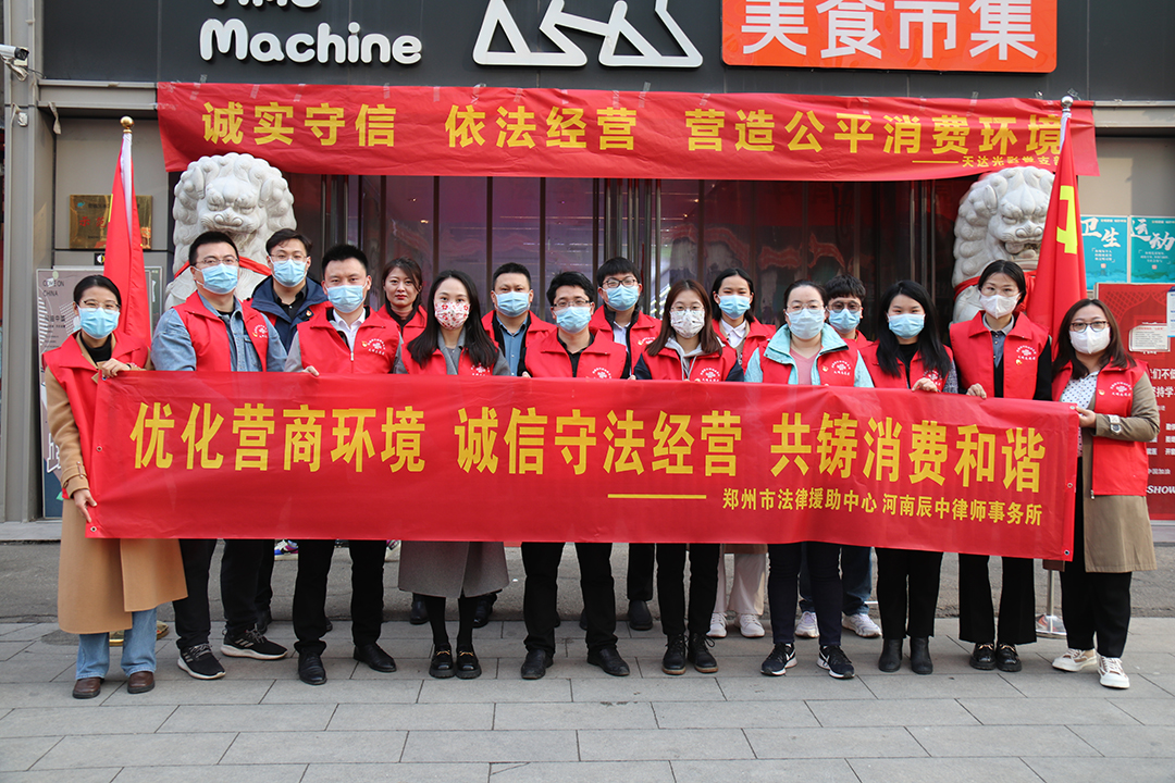 为全面开展“我为群众办实事”实践活动,进一步提升消费者权益意识,共同促进消费公平,2022年3月12日下午,应天达光彩党支部邀请,河南辰中律师事务所联合郑州市法律援助中心在郑州市管城回族区光彩市场开展主题为“优化营商环境、诚信守法经营、共铸消费和谐”的3.15普法宣传活动。辰中所律师杨琛、邢军杰、李飞、吴伟、马志鹏、乔磊、张玉娥、郝然、李雅琦、支润、李丽平,以及实习律师马晓晓、王振国、刘羽希积极参加本次活动。